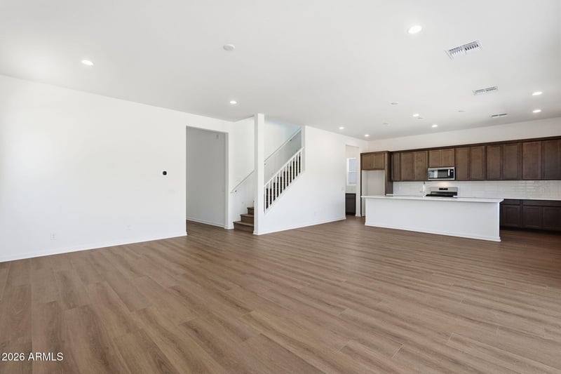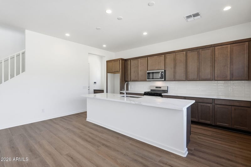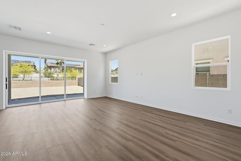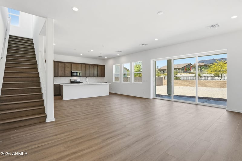 Listing details for 18028 Bighorn Ave, Goodyear, AZ 85338 : This thoughtfully designed home features a charming farmhouse exterior and inviting family-style layout. A covered entry and welcoming foyer lead past a bright office to the spacious great room, casual dining area, and covered patio, enhanced by a multi-slide pocket door for effortless indoor-outdoor living. The gourmet kitchen offers quartz countertops, Whirlpool appliances, a large center island with breakfast bar, ample cabinetry, and a walk-in pantry. Ten-foot ceilings and LVP flooring elevate the main level. The serene primary suite includes a generous walk-in closet and spa-like bath with dual-sink vanity, luxe shower, and private water closet. Secondary bedrooms provide ample closet space, complemented by a shared bath, powder room, centrally located laundry, and additional storage
