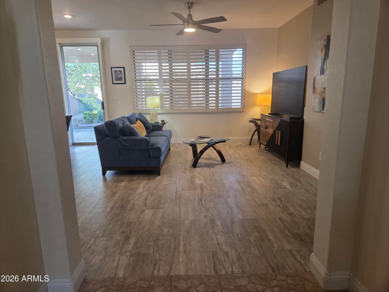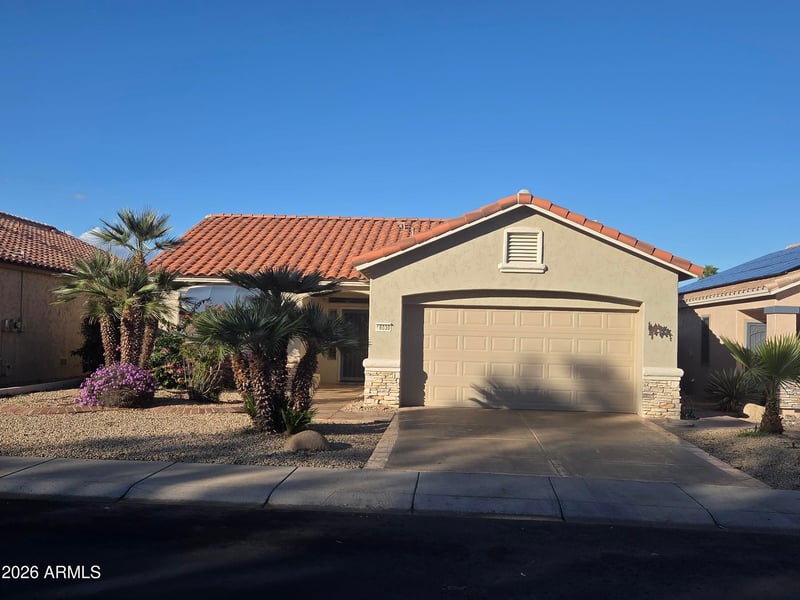 Listing details for 18030 Legend Dr, Surprise, AZ 85374 : 2 br/2 ba in fabulous Arizona Traditions (55+ gated community) off 175th Ave & Bell Road. Mountain view, terrific pools, clubhouse, golf course, pickleball, and more. House is recently renovated (not a flip), open concept, 9' ceilings, plantation blinds throughout. ALL NEW kitchen: cabinets, quartz countertops, and all new appliances including 5 burner gas range! 2nd bedroom has oak cabinetry built ins for an office, hobby or sewing room with space for guests. Primary & Guest baths have new quartz countertops, sinks, and faucets. Big Laundry Room (Kenmore washer/dryer convey) has a new stainless steel mop sink and a 48' x 81' oak PANTRY with pull out shelving. Ample fenced back yard for your dog (dog-friendly community, but this is a pet-free home). Plantation blinds throughout. Ceiling fans, beautiful foyer with huge hall closet, and more. Must see to appreciate. Central a/c & HVAC recently fully serviced, ducts cleaned. EV charger in the garage. Back Patio= 24' x 16' Garage: 2 car PLUS golf cart space + cabinets and workbench MUST SEE TO APPRECIATE the STORAGE, SPACE, QUALITY, AND SECURITY of this delightful home! Furnishing AVAILABLE.