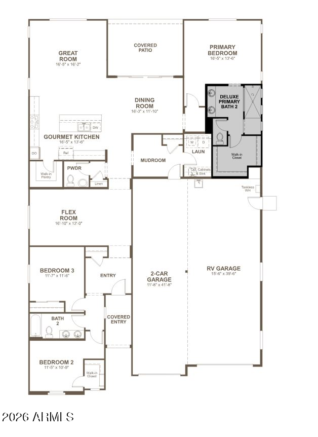 Listing details for 18135 Shiloh Ave, Goodyear, AZ 85338 : Explore this must-see Deacon home, ready for quick move-in! Included features: a covered entry; an open flex room; a gourmet kitchen offering stainless-steel appliances, a center island, a roomy walk-in pantry, and an adjacent dining room; an elegant great room; a secluded primary suite showcasing a generous walk-in closet and a deluxe bath with double sinks, an expansive rain shower; convenient laundry and powder rooms; two secondary bedrooms; a shared hall bath with double sinks; and a tranquil covered patio. This home also boasts airy 9' ceilings throughout.