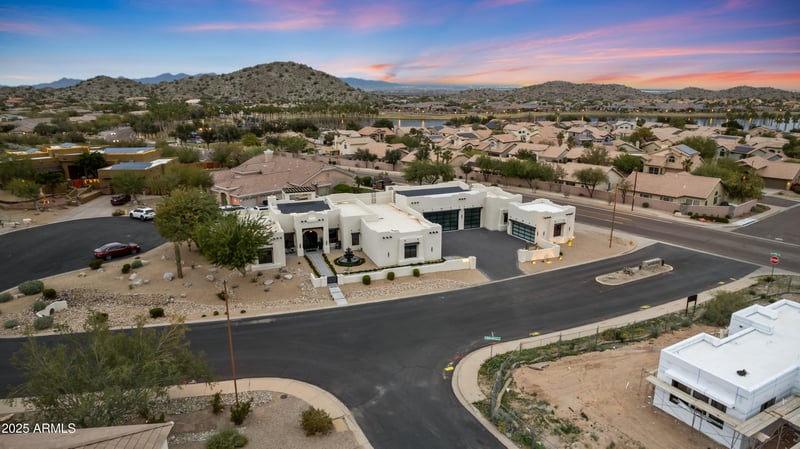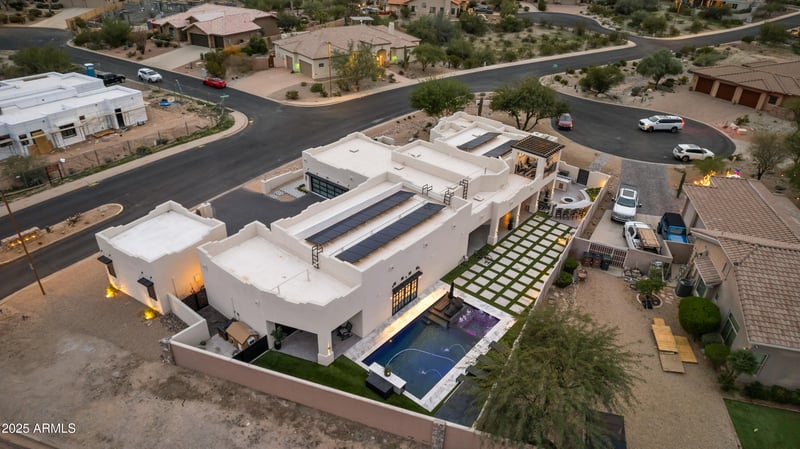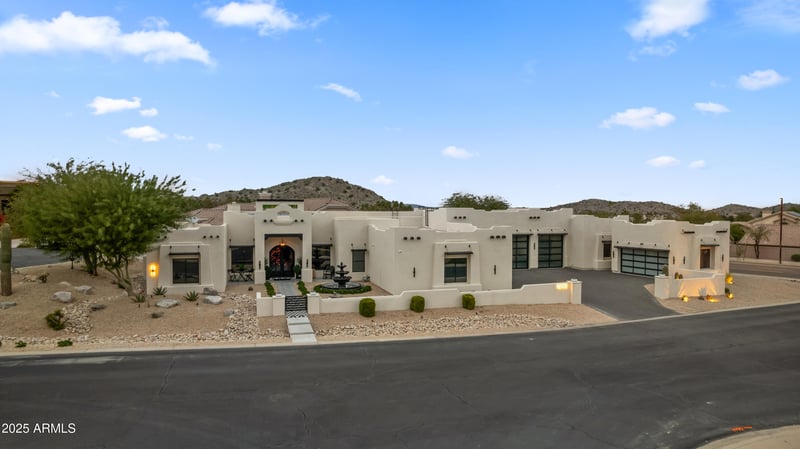 Listing details for 18190 Santa Alberta Ln, Goodyear, AZ 85338 : This isn't just a home, it's a statement. Set on a coveted corner lot in The Enclaves at Estrella Mountain Ranch with stunning mountain views, this Santa Fe-style showpiece delivers 3,000+ sq ft of bright, upscale living with tall ceilings, plantation shutters, and designer finishes. 4 bedrooms, 3 baths, a private guest suite with shower and a dedicated office for real-life function. Resort backyard is dialed in with a heated PebbleTec pool w/ automation, built-in fireplace, fire pit, new deck/tile, synthetic turf, and ambient lighting. The garage package is the flex: 7-car garage with lift (included), 2 EV chargers, plus a detached 2-car garage with mini split. New solar, 3 new Trane A/C units, and a custom kitchen with white granite and 48'' ZLINE gas range. Turnkey, rare, unforgettable.
