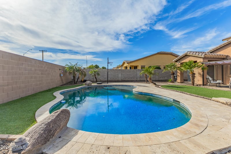 Listing details for 18221 Carmen Dr, Surprise, AZ 85388 : Discover this stunning two-story home with a private pool in Surprise Farms in Surprise, AZ! OWNED SOLAR means low electric bills!! Bright, open living areas feature tile flooring, abundant natural light, built-in surround sound, and warm designer tones. The upgraded kitchen boasts staggered cabinets with crown molding, mosaic backsplash, granite countertops, stainless steel appliances, and a large island with breakfast bar. Enjoy added flexibility with a spacious loft and den. The primary suite offers a walk-in closet and dual-sink bath. Relax outdoors with a covered patio, travertine pavers, artificial turf, and a sparkling pool--perfect for Arizona living!