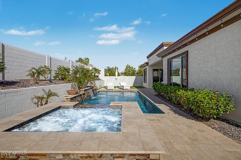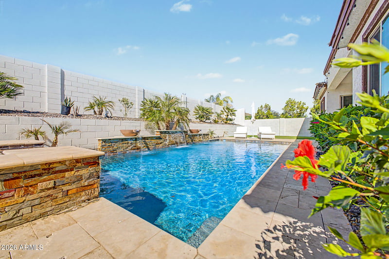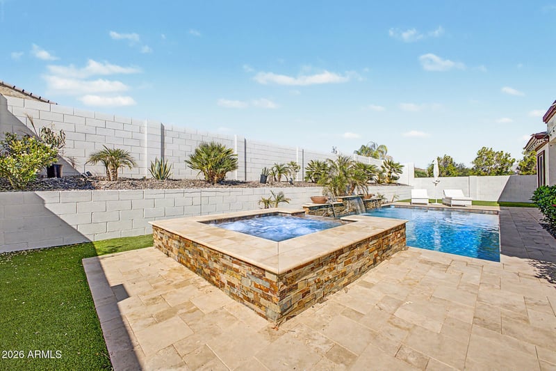 At the heart of the home is an impressive chef's kitchen featuring a large granite island, gas cooktop, abundant cabinetry, oversized walk-in pantry, and generous dining and gathering spaces. The primary suite is a true retreat with private backyard access, dual vanities, a soaking tub, oversized walk-in shower, and spacious walk-in closet. Step outside to your own private vacation-style backyard featuring travertine tile, artificial turf, a covered patio, and a custom pool and spa with a sheer descent waterfall, perfect for relaxing, entertaining, and enjoying Arizona sunsets. Additional upgrades include solar panels, app-controlled pool and lighting features, whole-home water softener and purification system, fresh interior and exterior paint, upgraded lighting fixtures and fans throughout home, enhanced landscaping, and upgraded uniform tile flooring throughout.