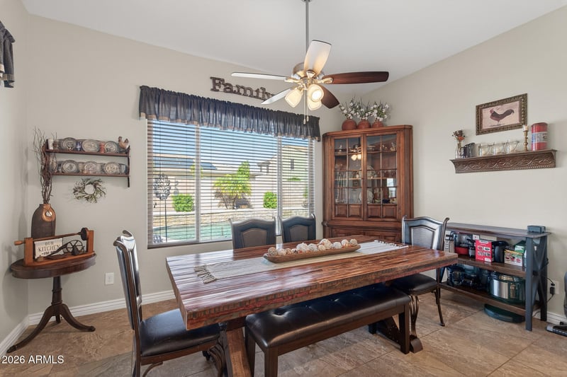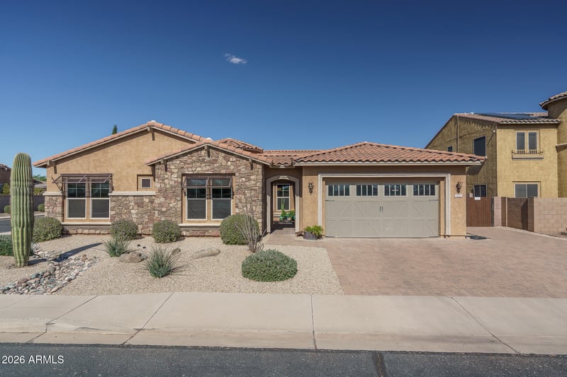 Listing details for 18398 Rimrock St, Surprise, AZ 85388 : This exquisite original-owner home is perfectly positioned on an expansive corner lot located in the gated community Surprise Farms. This home offers 3,081 SqFt of refined living space with 4 spacious bedrooms, an open den, and 2.5 baths. The thoughtfully designed floor plan features an elegant great room with a striking fireplace feature wall, a formal dining room, and a bright breakfast nook adjoining the gourmet kitchen. The kitchen showcases maple cabinetry with crown molding, granite countertops, designer tile backsplash, stainless appliances, a walk-in pantry, and an island with breakfast bar and pendant lighting. Multi-panel sliding glass doors create seamless indoor-outdoor living, opening to an extended covered patio with ceiling fans, roll-down shades, and paver flooring that continues beneath a stylish pergola. The backyard captures beautiful mountain views and features a sparkling pool with a stacked-stone water feature, lush artificial turf, and a natural gas BBQ island complete with a vertical smoker, ideal for entertaining. Permanent year-round seasonal lighting enhances ambiance, while shade screens on the east, west, and south exposures provide added comfort and efficiency. The oversized primary suite is a luxurious retreat with abundant natural light and a spa-inspired bath offering dual vanities, soaking tub, separate shower, and a generous walk-in closet. Additional highlights include a portico entry opening to a charming paver courtyard, stone-accented exterior elevation, a well-appointed laundry room with cabinetry, RV gate with paver driveway, and a 3-car garage with built-in cabinets and expanded paver drive.