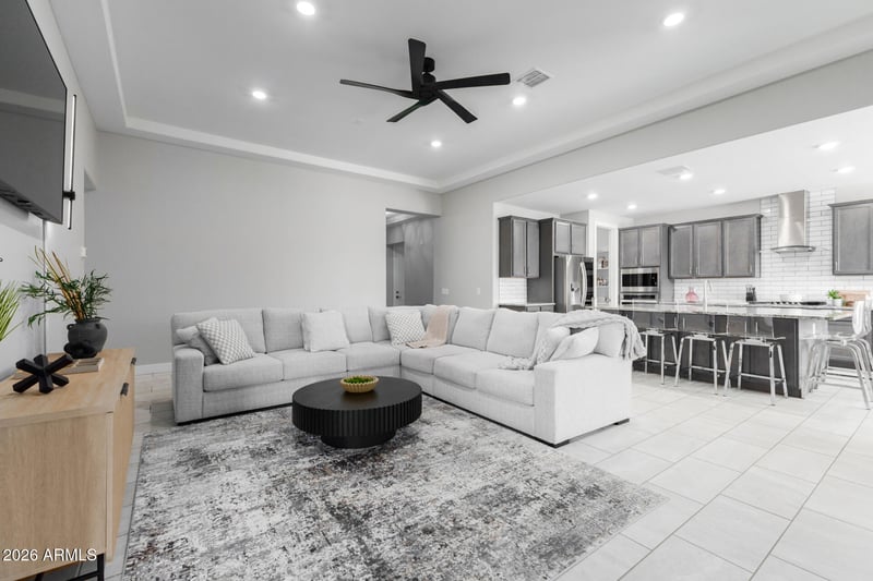 Listing details for 18399 Brookwood Dr, Goodyear, AZ 85338 : Single-level home with private pool in Estrella. Built in 2022, this 5-bedroom, 3-bath residence offers 2,770 sq ft, a 3-car garage, private pool, and a highly functional layout featuring five true bedrooms plus a dedicated teen room, ideal for larger households, guests, or flexible living needs. The open great room connects seamlessly to a chef's kitchen with granite countertops, a subway tile backsplash, dark cabinetry, stainless steel appliances, a gas cooktop, wall ovens, and an oversized wraparound walk-in pantry. The design supports everyday living as well as large-scale entertaining. Over $100,000 in recent upgrades deliver a true turnkey experience, including a pebble-finish swimming pool, artificial turf, putting green, outdoor kitchen, and retractable screen on the covered patio and a custom closet install in the primary suite. The fully finished backyard is designed for low-maintenance Arizona living and year-round enjoyment. Located in the highly sought-after master-planned community of Estrella, residents enjoy access to resort-style amenities, including the Starpointe Residents Club, the Presidio Residents Club, and the Yacht Club, which offer pools, fitness centers, lakes, trails, and community events. Estrella is known for its mountain setting, limited pass-through traffic, and lifestyle-driven design. Home may be sold fully furnished, providing a rare move-in-ready or vacation home opportunity.