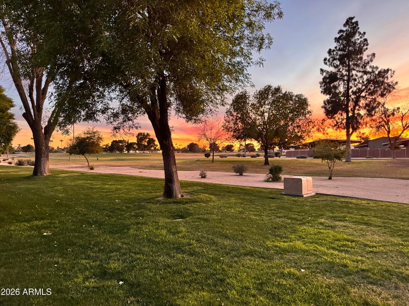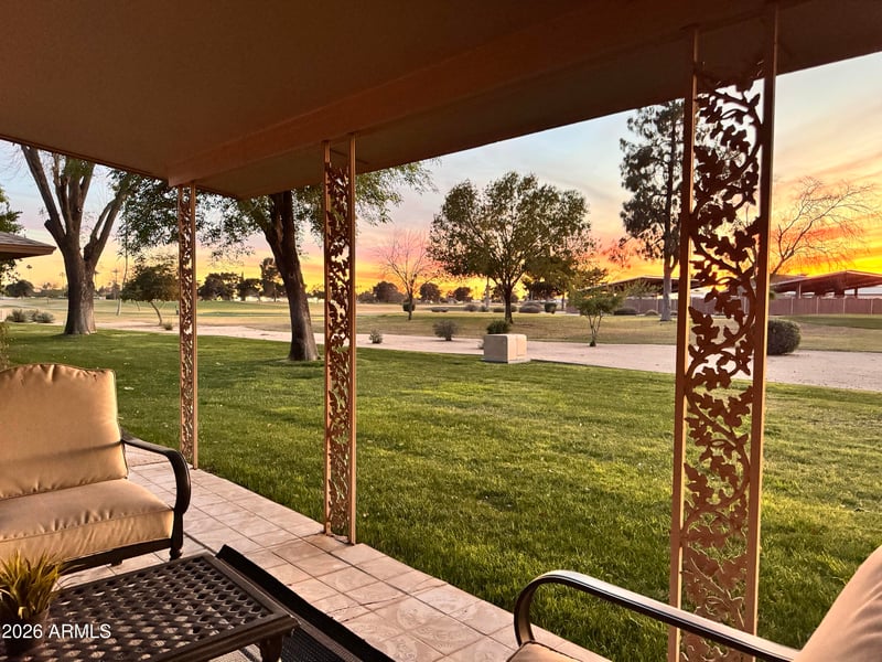 Listing details for 18442 104th Ave, Sun City, AZ 85373 : Updated home on a Golf Course Lot! What a DEAL! Wood-look flooring for easy maintenance, recessed lighting, ceiling fans, and Plantation Shutters. Stainless steel appliances, built-in mini wine fridge, Quartz counters, tile backsplash and large windows to enjoy the morning sunshine! Serene main bedroom promises a good rest with views of the golf course. New plush carpet, walk-in closet. Secondary bedroom includes direct outdoor access to private enclosed patio & walk-in closet. Bathroom has its own built-in heater system! Spend quiet mornings under the covered patio on the golf course near the 9th hole! Private front patio! 2-Car Garage features Golf Cart parking with ramp, and a wall of storage cabinets! Optional Roll-down metal shutters make it more secure when out of town! Convenient lo location near several recreation centers including swimming pools, pickleball, social events, gyms, and more!