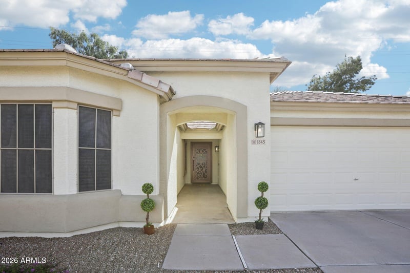 Listing details for 1845 Aloe Pl, Chandler, AZ 85286 : Excellent location in highly sought-after South Chandler! Just minutes from top-rated schools, shopping, dining, movie theaters, and major retail hubs, this home puts convenience front and center. Enjoy the nearby greenbelt for everyday outdoor fun, plus easy access to Paseo Vista Recreation Area featuring an archery range, disc golf course, dog park, playground, and scenic walking and biking trails. This inviting 4-bedroom, 2-bath home welcomes you with a long, covered walkway leading to the front entrance. Inside, you'll find a spacious Great Room and an open kitchen loaded with cabinet space, a center island, built-in desk, and recessed lighting. The split floor plan offers privacy, while the oversized primary suite features a separate shower and soaking tub. Step outside to a covered patio and enjoy the bonus everyone wants -- no neighbors directly behind you. Fresh custom neutral paint makes this one truly move-in ready. Location, layout, and privacy. That's the trifecta.
