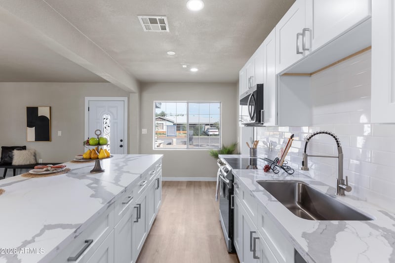 Quartz Countertops, Eat-in Kitchen, No Interior Steps and Kitchen Island