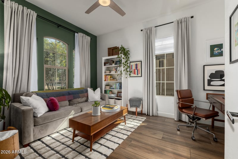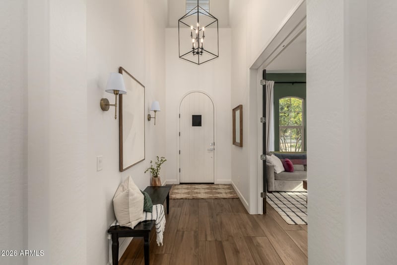 Listing details for 18491 Arrowhead Trl, Queen Creek, AZ 85142 : Experience refined living in the gated community of Rosewood Grove with this beautifully designed luxury residence offering more than 3,240 square feet of thoughtfully crafted space. Featuring 4 spacious bedrooms plus a den and loft, 2.5 bathrooms, and bright open living areas filled with natural light, this exceptional home blends elegance with comfort at every turn. A welcoming foyer leads to a private den or office with French doors, and flows into the stunning great room showcasing luxury plank tile flooring, soaring ceilings, and a formal dining area highlighted by a charming bay window. Expansive sliding glass doors create a seamless connection between indoor and outdoor living, perfect for effortless entertaining. The downstairs power room & central vac system throughout provide added convenience. The gourmet kitchen is truly a showpiece, complete with a striking beamed ceiling, gorgeous granite countertops, crisp white cabinetry with crown molding, high end stainless steel appliances, a custom glass tile backsplash, R/O drinking water, and an oversized island ideal for gathering. An inviting seating area and sunny dining nook provide the perfect setting for casual meals and relaxed mornings. The first floor primary suite is a serene retreat featuring vaulted beamed ceilings and a spa inspired en suite bath with dual vanities, a soaking tub, walk-in shower, and two generous walk-in closets. Upstairs, a spacious loft offers additional flexibility alongside three guest bedrooms and two bathrooms, including one bedroom with its own private en suite. Step outside to a covered patio with extended pavers overlooking a beautifully landscaped backyard designed for relaxation and enjoyment. Ideally located just minutes from top rated schools, premier shopping, dining, golf, recreation areas, and convenient freeway access, this remarkable home offers luxury living in an unbeatable location.
