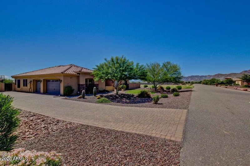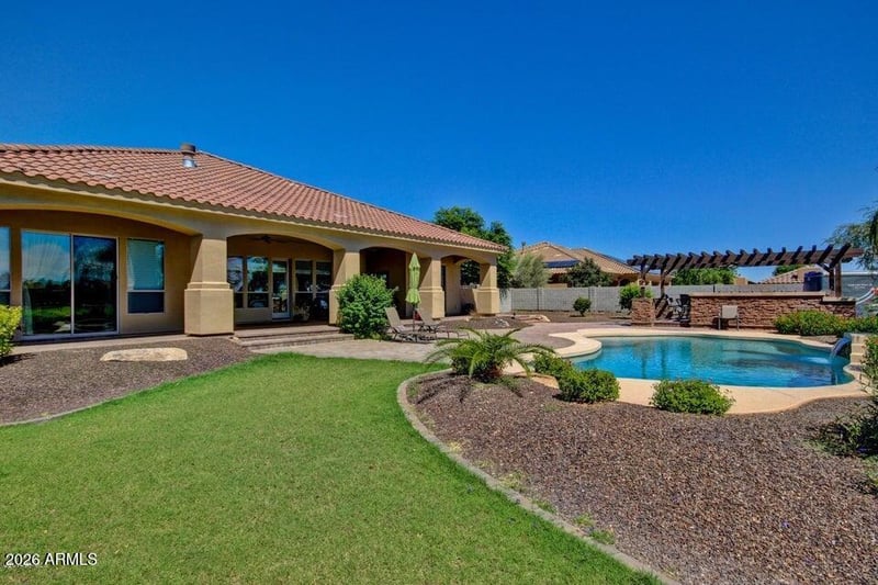 Listing details for 18509 Rancho Ct, Litchfield Park, AZ 85340 : Highly sought after acre lot homes in gated community! Rare oversized detached garage/shop with AC, large RV parking bay and multi car bay with lift. Perfect living and entertaining layout with open great room floor plan, dramatic elevated ceilings, custom naughty alder cabinets, large kitchen island with extra storage, built in Viking stainless appliances, large gas cooktop, travertine tile, wood flooring, custom built ins, spa like master bathroom with snail shower and jacuzzi tub, guest suite with bathroom and living area at the front of the home with its own entrance from the front patio, paver extended back patio with outdoor kitchen, pool, grass, mature trees, north/south exposure, this home is a must see!