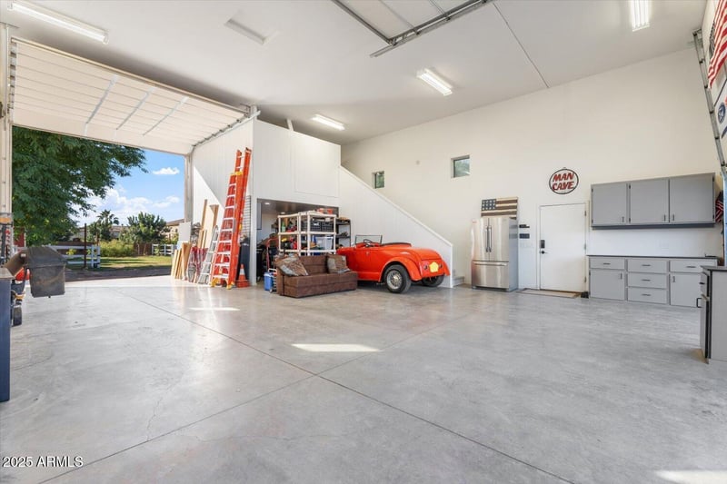 The 3-car garage (26' deep) is finished with custom cabinets, countertops, 220-volt outlet, and painted floors. Car lovers and hobbyists will love the 30x45 RV garage featuring dual 14x14 drive-through doors, and a 13x12 mezzanine for extra storage or workspace.