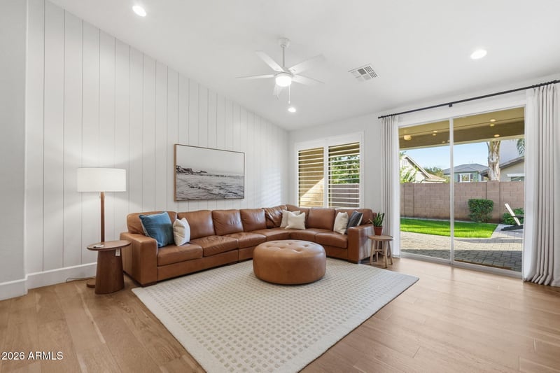 Listing details for 18541 Superstition Dr, Queen Creek, AZ 85142 : Charming, recently remodeled home in the desirable Cortina community, featuring thoughtful upgrades and a warm, inviting feel throughout. Highlights include: European oak wood flooring throughout • Modern lighting • Custom trim in living and family rooms • Modern clean-edge shutters throughout • Custom kitchen island • Built-in refrigerator and freezer • Unlacquered solid brass hardware • Three sets of deep base cabinet drawers • Office with two custom closets and built in shelving • Remodeled walk-in shower in the master bathroom • Generous pavered front and backyard • Space for parking play or basketball • Four car tandem garage • Cortina is a fun neighborhood with lots of green spaces, parks and playgrounds, community pool and splash pad.