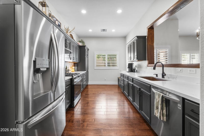 Listing details for 18650 91st Ave #1201, Peoria, AZ 85382 : Move-in ready, stylish, and low-maintenance living at its best. This beautifully updated 3-bed, 2-bath end-unit townhome in the gated 45+ Westcreek Villas offers comfort and thoughtful upgrades throughout. Vaulted ceilings create an open feel, highlighted by wood beamed ceiling in primary. The remodeled kitchen features quartz countertops which then flows into the living space with hardwood floors, a cozy fireplace, shiplap accents, and built-in entertainment center. Plantation shutters and ALL NEW windows (2024) add efficiency and charm. Secondary bedroom includes built-ins—ideal for a home office or guest room. Interior laundry, 2-car garage, soft water system, new water heater (2024), private patio, steps to the community pool complete this easy, lock-and-leave home.