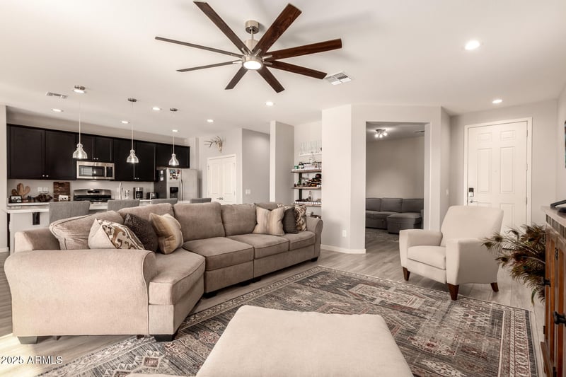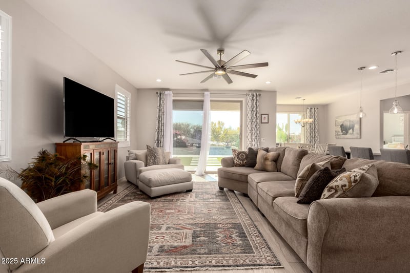 Listing details for 18717 Georgia Ave, Litchfield Park, AZ 85340 : Your Gorgeous DREAM home with sparkling POOL is here in Zanjero Trails! Perfectly positioned for privacy, with no neighbors behind, backing to a lush greenbelt and framed by tranquil mountain views. This gorgeous residence also offers 3 beds + den, 2 baths, 2-car garage, & a mature landscape. The interior exudes elegance with plantation shutters, abundant natural light, stylish light fixtures, & wood-look tile flooring t/out. Designed for everyday living & entertaining, the seamlessly flowing open layout is sure to impress! The impeccable kitchen boasts SS appliances, quartz counters, a double-door pantry, ample espresso cabinetry, recessed & pendant lights, and a large island w/breakfast bar. Versatile den for an office! The main bedroom has an ensuite with dual sinks & a walk-in closet Beyond the interiors, the backyard holds its own charm! Excellent for relaxation and entertainment with a covered patio, artificial turf, a built-in BBQ, a view fence, and a sparkling pool w/waterfall feature. What's not to like? See it! Love it! Live it!