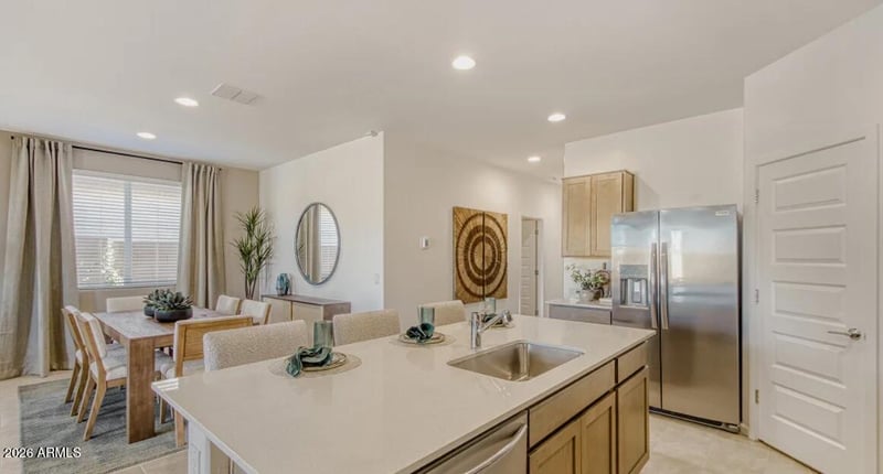 Summit Collection offers single-family homes for sale in Montecito at Estrella, a new neighborhood in Goodyear, AZ. Residents enjoy 65+ miles of trails, 50+ parks, 72 acres of lakes, Yacht Club, and championship golf at the Golf Club of Estrella. They also have access to residents' clubs--featuring heated pools, fitness centers, restaurants, event spaces, and StarSplash WaterPark. This home comes fully equipped with all brand-new stainless steel kitchen appliances and is complete with 12X24 tile flooring, stunning quartz countertops, and stylish maple almond cabinetry, designed for both comfort and function. Photos are of model home.