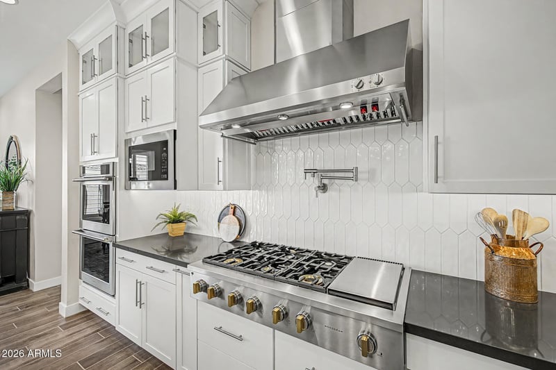 Listing details for 18826 Celtic Manor Dr, Queen Creek, AZ 85142 : Stunning single-level home on a premium corner lot in the highly desirable Legado community. Featuring 4 bedrooms plus den and bonus room, 3.5 baths, a 3-car garage, extended paver driveway, and RV gate. The open-concept layout offers wood-look tile, plantation shutters, and expansive multi-panel sliding doors. The chef's kitchen stands out with luxury Monogram appliances, two-tone quartz countertops, R/O system, white cabinetry, designer backsplash, oversized island with breakfast bar, and walk-in pantry. The spacious primary suite includes backyard access and a spa-inspired bath with soaking tub, dual-nozzle walk-in shower, and walk-in closet. Enjoy a low-maintenance backyard with covered patio, pavers, and turf, just minutes from premium shopping, dining, and entertainment.