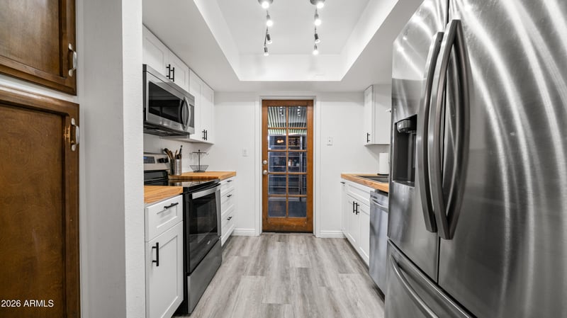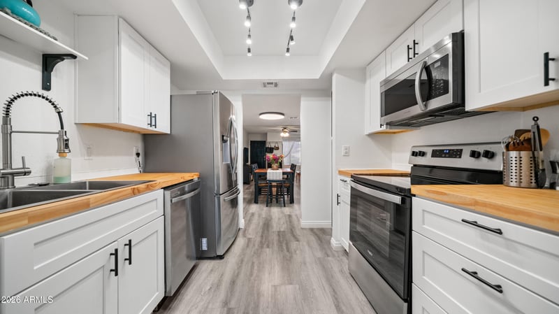 Listing details for 1927 Hampton Ave #115, Mesa, AZ 85204 : Move in Ready & Beautifully Updated! This 2 bed, 2 bath, 1st floor condo offers comfort, convenience, and a highly functional split floorplan. Updated kitchen featuring refreshed cabinetry, a modern sink, butcher-block countertops, & matching stainless steel appliances. Also includes a BRAND NEW Water Heater (2026), NEW Electrical Panel (2025). The spacious primary suite includes a generous walk-in closet, while the secondary bedroom sits privately on the opposite side of the home - ideal for guests, roommates, or a home office. Refrigerator, washer, and dryer are all included, making this an easy turnkey option. Enjoy a relaxed lifestyle with access to community amenities including a sparkling pool, spa, BBQ area, greenbelts, and walking paths.