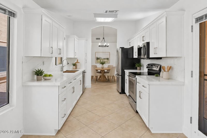 Listing details for 19532 88th Dr, Peoria, AZ 85382 : Beautifully remodeled St. Thomas floor plan located in the highly sought-after Vista Crossing enclave of Westbrook Village. This light and bright home has been thoughtfully updated throughout, offering a true turnkey opportunity. The kitchen features crisp white cabinetry, Atmos Gold quartz countertops, stainless steel appliances, and a Ruvati sink with integrated drying rack system, combining both style and functionality. The layout offers an open feel while maintaining defined living spaces. Both bathrooms have been tastefully renovated with new cabinetry and matching Atmos Gold quartz countertops, including the primary suite with raised-height vanities and a custom roll-in tiled shower. Additional upgrades include updated modern lighting, brushed nickel hardware, fresh interior paint, and new carpeting throughout. The home is also mechanically sound with a newer A/C system (approx. 3 years old) and a recently replaced roof (approx. 2 years old), providing peace of mind for years to come. Enjoy the ease of low-maintenance living in Vista Crossing, where the HOA covers front yard landscaping and roof replacement, along with access to heated pools and resort-style amenities. Ideally situated just steps from one of the community pools, this home offers both convenience and lifestyle in one of Westbrook Village's most desirable neighborhoods.