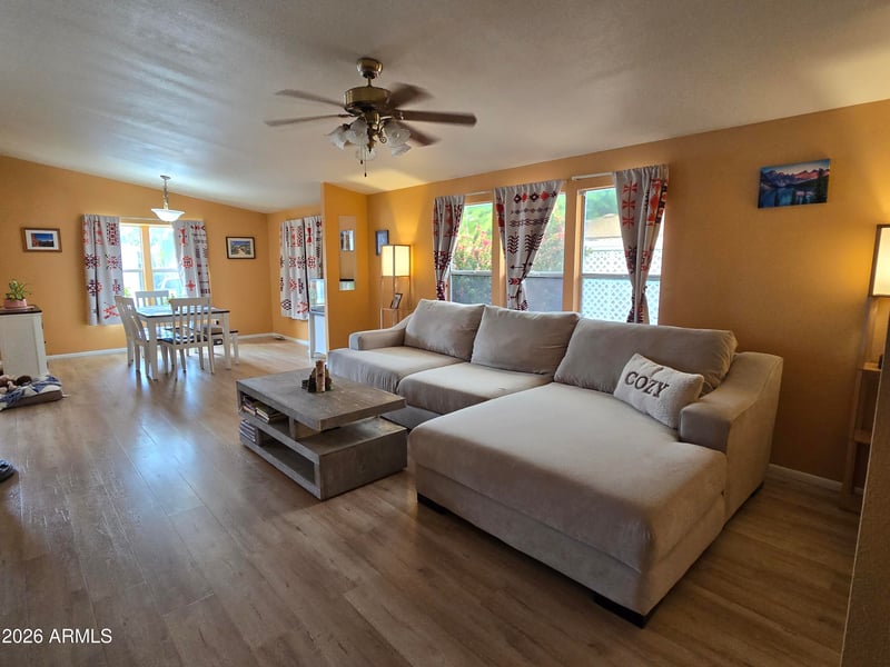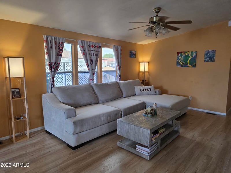 Listing details for 19602 32nd St #50, Phoenix, AZ 85050 : This well-maintained 3-bedroom, 2-bath home offers comfort and thoughtful upgrades throughout. Enjoy natural light from skylights in the kitchen and primary bathroom, creating a bright and inviting atmosphere. The kitchen was beautifully remodeled in 2023, complemented by newer flooring installed in 2018. A newer water heater adds peace of mind. Designed with accessibility in mind, the home features a convenient ramp for easy entry. Relax on the welcoming front porch or take advantage of the insulated Tuff Shed--complete with lighting and A/C--perfect for storage, a workshop, or hobby space. All ages community. You must get pre-approved by the community.