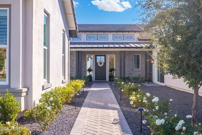 From the moment you enter, you are greeted by soaring ceiling elevations, expansive open living spaces, and an abundance of natural light. The oversized pocket slider fully disappears into the wall, opening the great room to the backyard and transforming the home into a true indoor-outdoor retreat. Step outside to your own private resort-style oasis featuring a pool and spa combination, oversized Baja shelf, and a gorgeous pool grotto. Multiple covered patios create the perfect setting for hosting, relaxing, and enjoying Arizona's year-round outdoor lifestyle.
