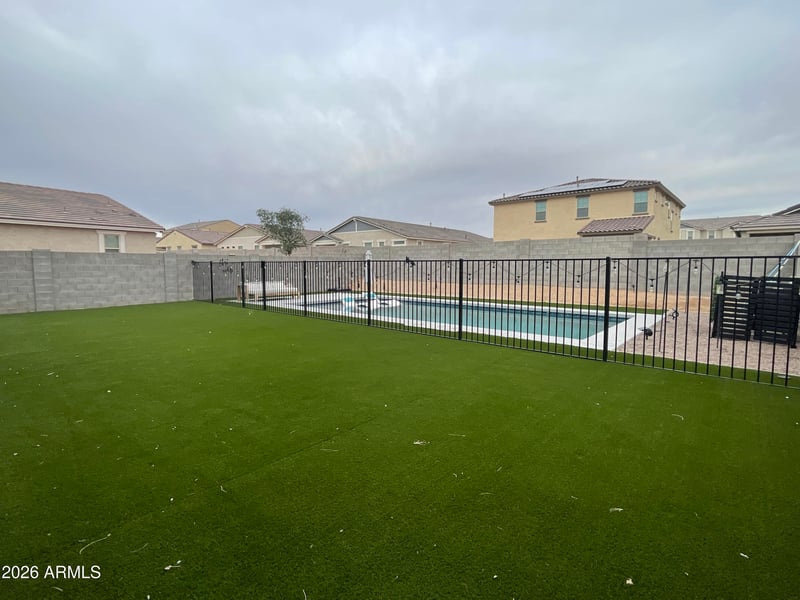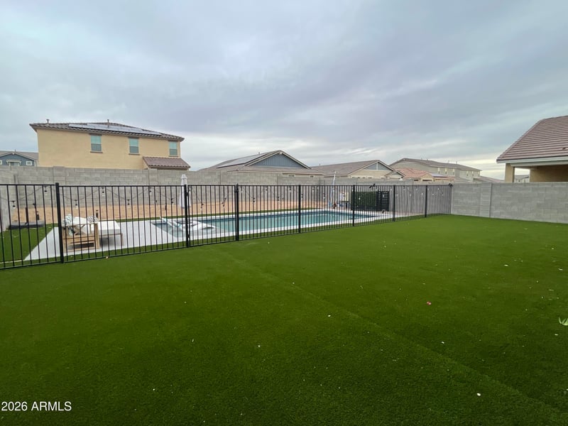 Entertainer's backyard with covered patio, large synthetic grass area and fenced pool with baja step.