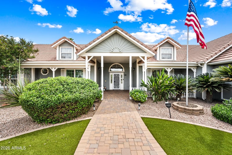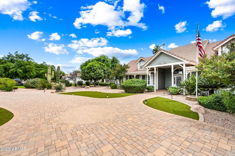 Listing details for 19917 Calle De Flores --, Queen Creek, AZ 85142 : Wait no longer--your dream home is here! Welcome to this stunning 5 bedroom + flex room, 4 bath, 3-car garage estate offering 4,005 sq ft in the highly sought-after Circle G at Queen Creek. From the moment you arrive, the curb appeal is unforgettable--featuring a wraparound driveway, synthetic grass, charming cottage-style porch with white picket fence and grand columns, glass-insert front door, and extended driveway leading to an RV gate. Step inside and experience refined elegance with a statement chandelier, gray plank tile flooring, wainscoting, crown molding, and new windows adorned with crisp white shutters. The formal dining/flex room showcases a coffered ceiling and bay window overlooking the entertainer's backyard. The chef's kitchen is a true showpiece, highlighted by a leathered granite island with breakfast bar, classic chandelier pendant lighting, 42" antiqued white shaker cabinetry with glass accents, glass tile backsplash, and a striking copper vent hood. Complete with stainless steel appliances, double ovens, gas cooktop, built-in microwave, oversized walk-in pantry, RO system, and a built-in buffet--this space was designed to impress. The great room offers a warm and inviting atmosphere with a custom built-in entertainment center, bookshelves, and a cozy fireplace with a custom copper screen. Retreat to the newly renovated luxurious primary suite featuring coffered ceilings, three walk-in closets (including a newly added custom system), and a spa-inspired bath with a freestanding soaking tub under a classic chandelier, oversized walk-in shower with pebble flooring, rain and handheld fixtures, dual vanities with makeup station, updated lighting, and a private water closet. Step outside to your private backyard oasis--complete with a covered patio and Alumawood extension, Pebble Tec pool with rock waterfall and Baja step, built-in BBQ and separate bar with seating and electrical, a charming white gazebo with lighting, fire pit, RV gate with ample storage space, three storage sheds, and mature landscaping. Recent updates include new windows throughout, plantation shutters, renovated primary bath, mini split in garage (2025), HVAC units replaced (2024), water heater (2020), and RO system (2025)