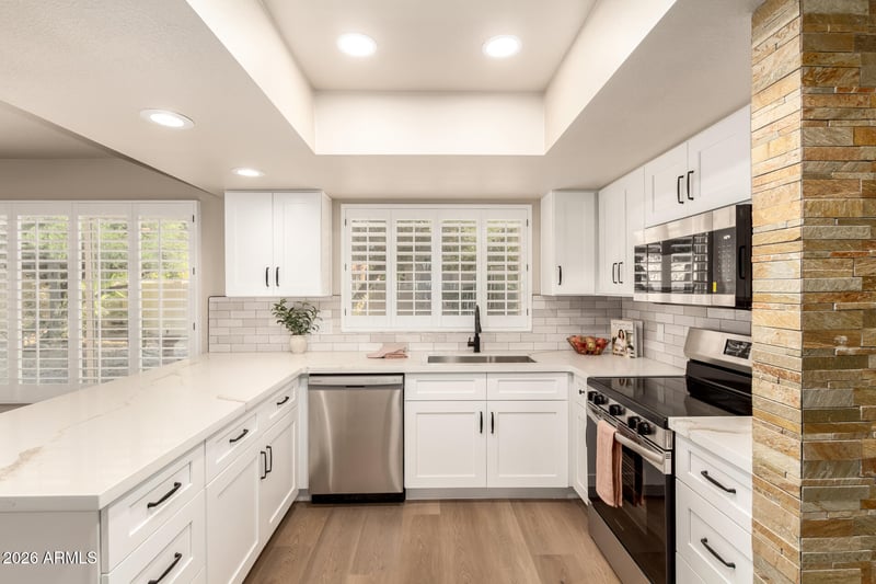 Listing details for 20073 98th Ave, Peoria, AZ 85382 : Fully remodeled on almost 1/3 acre lot in Westbrook Village! 3 bed/2 bath property with 2-car garage plus golf cart parking greets you with warm, inviting living and family rooms perfect for relaxing & entertaining. New luxury vinyl plank flooring and paint throughout home. Kitchen and baths are sure to impress w/brand new white shaker cabinets & quartz countertops, new stainless steel appliances and bfast bar in kitchen ideal for casual meals or morning coffee. Retreat to the main bedroom featuring dual sinks and a walk-in closet with built in storage. Shutters throughout the home plus indoor laundry. Enclosed AZ room offers a great spot to unwind or enjoy the outdoors. Set in an active adult community with pools, tennis, pickleball, golf and more plus local amenities, this home is the o