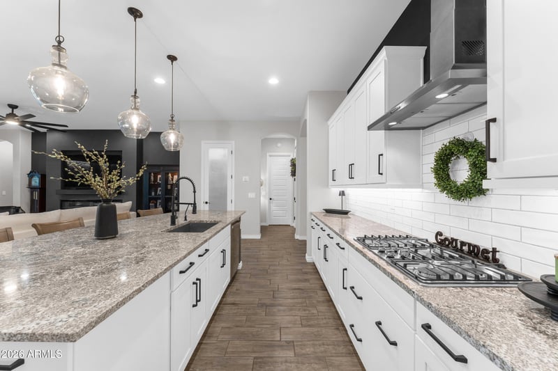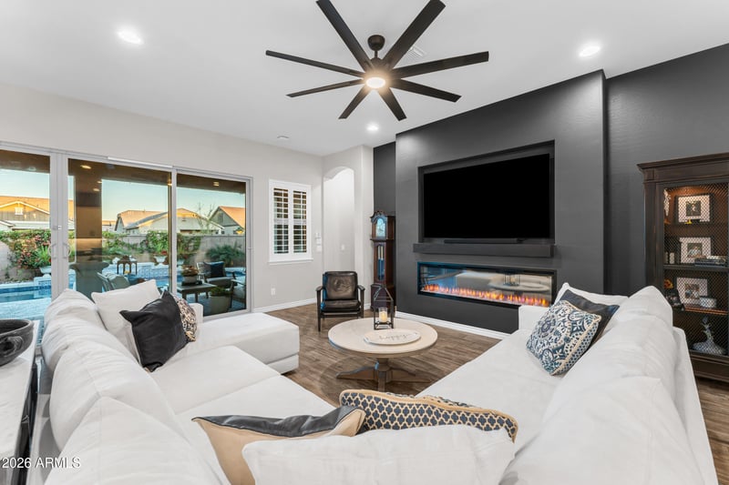 Listing details for 20237 229th Way, Queen Creek, AZ 85142 : Welcome to this stunning 4 bedroom, 3 bath home in Barney Farms with a tandem 3-car garage that feels just like new without the long wait. From the moment you arrive, the cozy front porch and iron security door invite you in. Inside, you are greeted by a bright foyer with two-tone paint and designer touches that carry through the home, along with beautiful plank tile flooring and plantation shutters. The kitchen is the true heart of the home, made for gathering, with 42-inch cabinets, a large granite island, granite counters, gas stove, wall oven, and a spacious walk-in pantry. The great room offers a built-in wall unit with a fireplace and plenty of space to relax or entertain, while the dining area is perfect for hosting. Large atrium sliders open to an amazing backyard with a heat saltwater pool, in-floor filtration cleaning system, fountain, colorful lights, volleyball netting, and plumbing ready for a spa, paved patio and paved side gates. The primary suite is a peaceful escape with its own exit to the yard, a large closet, soaking tub, and walk-in shower. A standout feature is the private mother-in-law suite with its own living space, bedroom, and bathroom, perfect for guests or extended family. Located in Barney Farms in Queen Creek, the community offers parks, walking paths, green spaces, and community pools to enjoy the outdoors. With added upgrades like rain gutters, epoxy garage floors, tankless water heater, and water treatment system, and low voltage this home offers comfort, style, and space in one beautiful package.