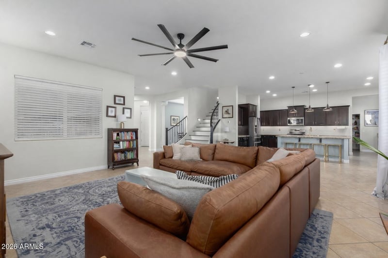 Listing details for 20252 Quintero Rd, Queen Creek, AZ 85142 : Recently repositioned and aggressively priced, this home stands out as one of the best values per square foot in the Victoria community. Conveniently located near schools, shopping, dining, the library, Queen Creek Marketplace, and Schnepf Farms, it offers easy access to everyday essentials and local favorites. With 5 beds, 3.5 baths, a den, and an upstairs loft across 3,683 sqft, the layout offers flexibility for a variety of living needs, including space for guests or work-from-home setups, with the option for a main-level primary suite, ideal for multi-generational living. The open-concept kitchen and living area feature a large island with breakfast bar, granite countertops, abundant cabinetry, and a pantry nook, all flowing seamlessly into the dining and main living spaces. Recent updates enhance the home throughout, including Mohawk RevWood laminate flooring in a rich chestnut tone in all areas previously carpeted. Interior walls and exterior doors have been freshly painted, complemented by updated light fixtures, newer ceiling fans, and added laundry room shelving.