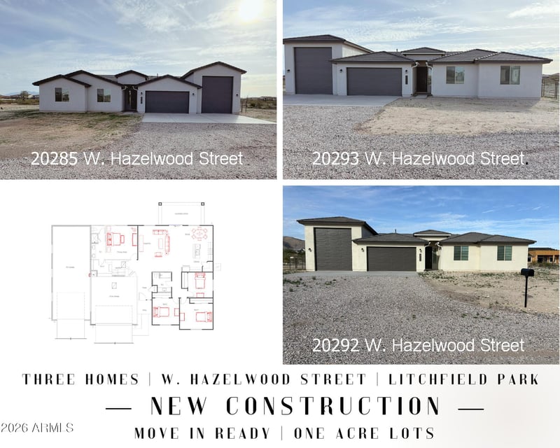 Listing details for 20293 Hazelwood St, Litchfield Park, AZ 85340 : Welcome to 20293 W Hazelwood Street a single family home move in ready. See the two other newly constructed residences available on 20285, and 20292, each offered at $650,000. These homes are also available as a rent with option to buy. USE THESE DIRECTIONS ADDRESSES ARE NOT ON GPS....195th Ave right to Medlock Drive. Medlock Drive to 199th Ave. then left to Camelback Rd. Right on Camelback Rd to 201st then make a left. There is no sign for W. Hazelwood, it is the 4th street on your right and go to the end of W Hazelwood for the four homes. 2 on one side and 2 on the other of W Hazelwood St. Each home sits on approximately one acre and features a fully fenced backyard, an attached RV garage, and a shared well serving all four properties. Construction has just been completed and all homes are move-in ready. The open floor plan offersBuyer to verify all information deemed material to Buyer and conduct Buyer's own due diligence and investigations regarding the property. Information provided is deemed reliable but not guaranteed.