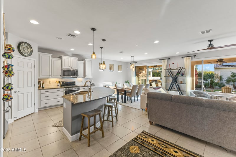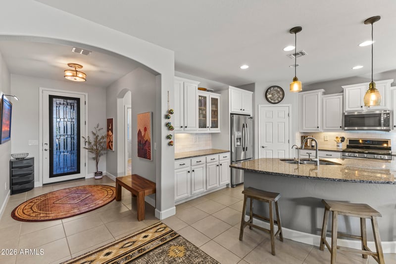 Listing details for 20421 275th Dr, Buckeye, AZ 85396 : Completely furnished and impeccably designed, this luxury modern Hideaway model showcases elevated finishes and curated details throughout. Tile flooring anchors the main living spaces, while newly carpeted bedrooms add comfort. The chef's kitchen features granite counters, upgraded cabinetry with glide-out shelving, gas range, newer dishwasher, walk-in pantry and designer pendants. The Primary Suite offers a bay window and custom closet cabinetry. 4-ft extention on insulated garage with built-in storage + golf cart. Stunning travertine patio with BBQ, fireplace, firepit and view fencing. Limited-edition prints from renowned artist Wyland included.