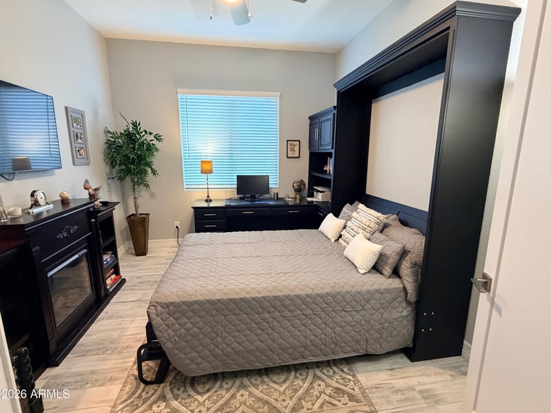 Listing details for 20472 Coolidge St, Buckeye, AZ 85396 : Professional pictures to come soon! Resort-style living in Victory at Verrado 55+! Built in 2021, this single-level home offers 2,142 sq ft with 2 beds, 2.5 baths, and a versatile den featuring a built-in desk and Murphy bed. Situated on a 0.23-acre lot, it includes a 2-car garage plus golf cart garage. Bright open layout with high ceilings and abundant natural light. Gourmet kitchen showcases a dramatic vaulted ceiling, high-end finishes, and seamless flow for entertaining. Backyard oasis with $120K+ in upgrades includes a heated pool with waterfall feature, travertine patio, mature landscaping, wood-burning fireplace, built-in BBQ, and gas fire pit--perfect for enjoying Arizona outdoor living year-round