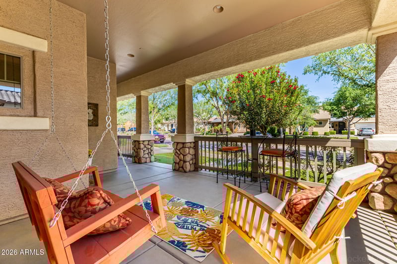 Listing details for 20617 Walton Dr, Buckeye, AZ 85396 : The search is finally over! This stunning 4-bedroom home in Verrado is perfectly positioned just steps from Walton Park and within walking distance to Verrado Elementary and Middle School. A charming front porch, lush artificial turf, and stone accents create a warm, elevated first impression. Inside, soaring ceilings, a soft designer palette, and abundant natural light enhance the open layout, while the great room with fireplace invites effortless gathering. The chef's kitchen showcases granite counters, white cabinetry with crown molding, tile backsplash, SS appliances, pantry, and a generous peninsula with breakfast bar. The beautifully remodeled primary bath features designer finishes, and the resort-style backyard offers a sparkling pool and built-in BBQ, ideal for entertaining. Imagine peaceful afternoons in the backyard, boasting a covered patio, a refreshing pool, a built-in BBQ with a dry bar, stylish pavers, and a fire pit for evenings under the stars. Don't miss out on this incredible gem!