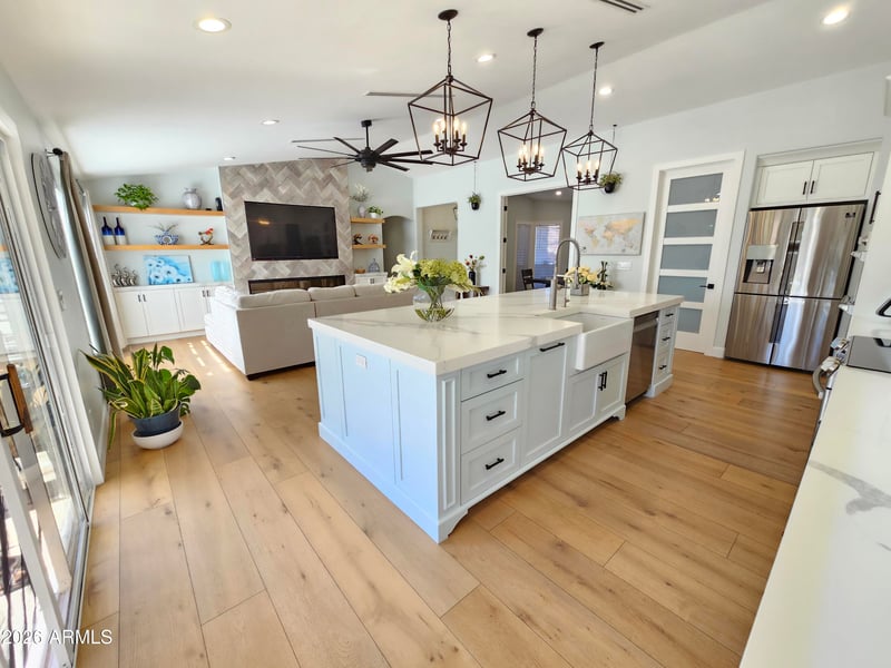 75" Built in TV. Custom built floating shelves on either side of media wall and Custom-built storage cabinets with custom thickness Quartz counter tops.