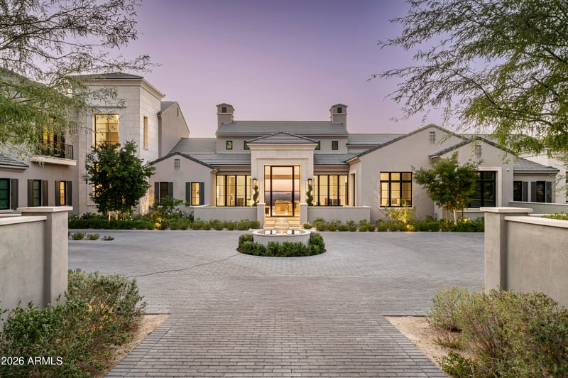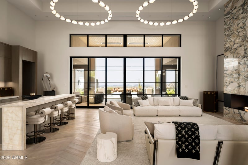 The resort-style backyard is highlighted by a negative edge pool and spa, along with a covered cabana featuring a pool house bath. A six-car garage accommodates an extensive vehicle collection. Ideally located just moments from Scottsdale's premier dining, shopping, and resort destinations, this exceptional estate delivers refined luxury in one of Arizona's most coveted communities.