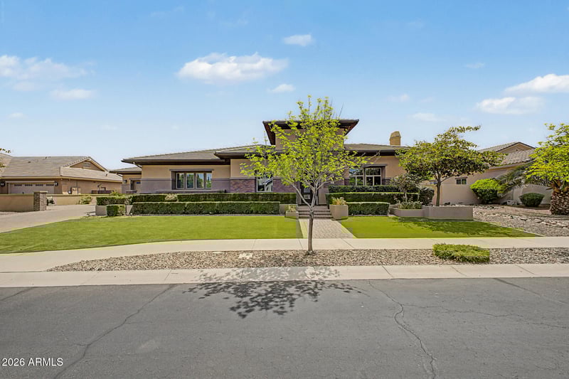 Listing details for 2087 Aris Dr, Gilbert, AZ 85298 : Luxury living in this stunning 5 Bed/6.5 Bath residence! Elegant interior boasts refined finishes such as gorgeous tile flooring, thick baseboards, tray ceilings, AC with electric air filters w/ UV lights & designer light fixtures throughout. Discover a formal living room with a gas fireplace, double doors opening to a versatile den, a modern powder room, a formal dining room with sliding doors to a side patio, & an expansive great room with another fireplace & surround sound speakers in the family area. Chef's dream kitchen showcases high-end SS appliances, cabinetry with crown moulding, granite counters, a huge island with dual sinks and a breakfast bar, a butler's service area, and a walk-in pantry. Split main suite features a sitting area, direct backyard access, an oversized . . . walk-in closet, & a spa-inspired bathroom with dual vanities, a soaking tub, and a glass-enclosed shower with a built-in bench. Every bedroom is designed with its own private bathroom! Additional highlights include a bonus room with backyard access, a functional mudroom, & a well-appointed laundry room with cabinets & a sink. Car enthusiasts & eco-conscious buyers will appreciate the 4-car garage equipped with an EV charger and insulated garage doors! Entertainer's dream backyard features a sparkling blue pool with water jets, a fire pit seating area, a covered patio with speakers, a built-in BBQ, & artificial turf areas. Resort-style living at its best!