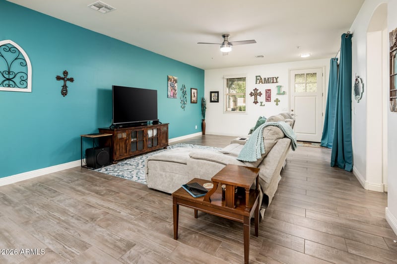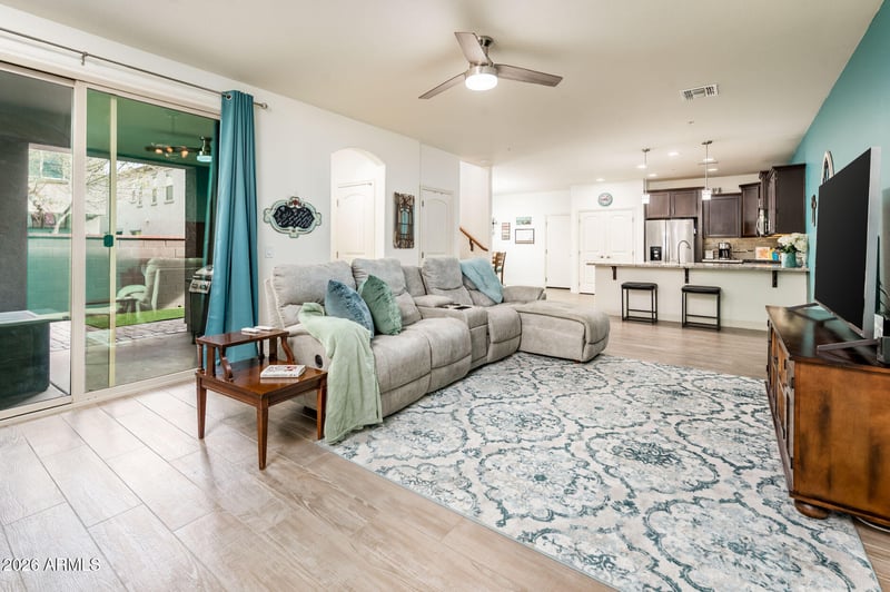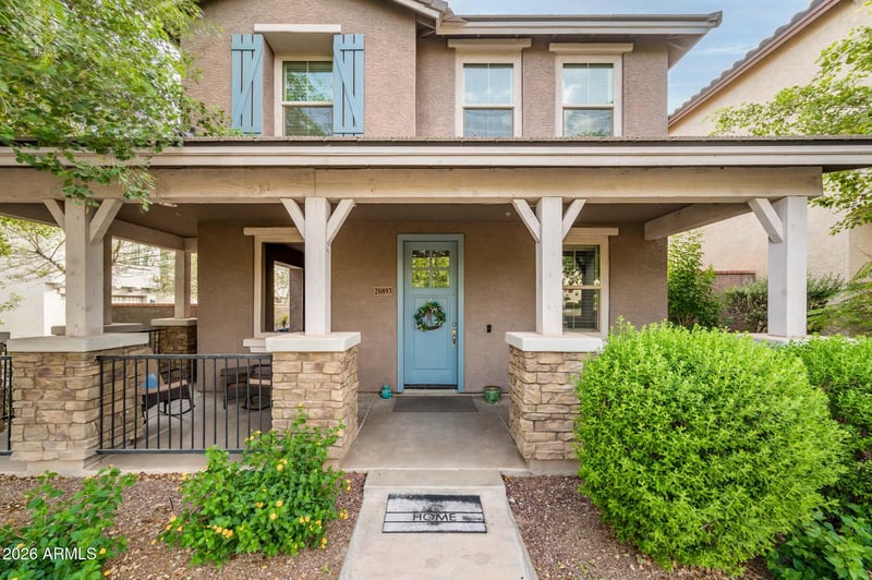 A spacious front porch welcomes you to this stunning 3-bedroom, 2.5-bath home, situated on a desirable corner lot in the heart of Verrado, surrounded by charming tree-lined streets and lush greenbelt.