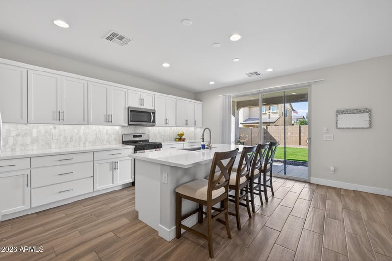 Listing details for 21262 Kingbird Dr, Queen Creek, AZ 85142 : This beautifully maintained, original-owner home offers an inviting blend of space, style, and comfort with 5 generously sized bedrooms, 3 baths, and 2,654 SqFt of thoughtfully designed living. An open great room layout and an upstairs loft create the perfect setting for both everyday living and entertaining. The stunning kitchen features crisp white cabinetry, quartz countertops, a modern tile backsplash, stainless steel appliances, and a spacious island with a breakfast bar ideal for casual meals. Sliding glass doors open to a covered patio and a low-maintenance backyard complete with artificial turf--an ideal play space for kids and pets. A convenient main-level bedroom and bath provide a perfect retreat for guests. Upstairs, the primary suite offers a peaceful escape with an en-suite bath showcasing a dual-sink vanity, oversized shower, and walk-in closet. Additional highlights include neutral décor, plank tile and plush carpet flooring, an upstairs laundry room, and an oversized 2-car garage with a service door to the backyard. Residents of Jorde Farms enjoy exceptional community amenities including a sparkling pool, adventure park and playground, multiple parks, and an extensive trail system.