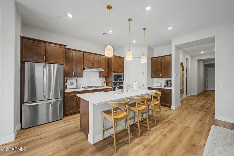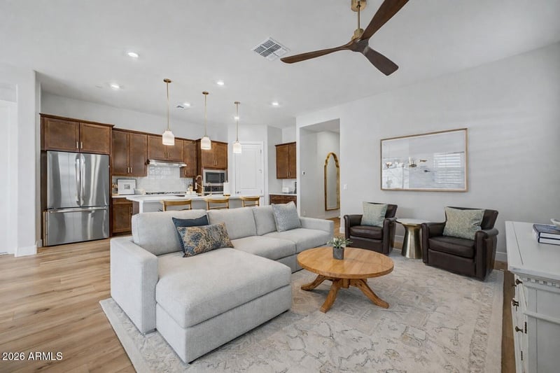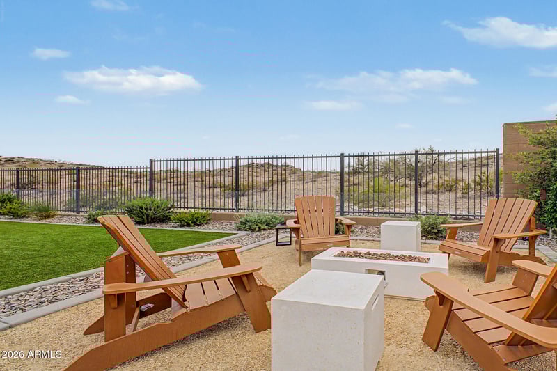 Listing details for 21325 Roanoke Ave, Buckeye, AZ 85396 : Beautifully upgraded single-story Meade floor plan with 4 bedrooms, 3 full baths, and 1,920 sq ft of thoughtfully designed living space. Spanish elevation exterior with bright open layout features 10' ceilings, upgraded LVP flooring, soft-close cabinetry, quartz countertops, a chef's kitchen with built-in fridge, range hood, and wall oven, plus floor-to-ceiling tile in the owner's shower. Enjoy added functionality with laundry and hallway cabinetry, tankless water heater, reverse osmosis and water softener included! Epoxy 2 car garage with overhead storage. Step outside to a premium view lot with an extended patio and resort-style backyard complete with pavers, turf, fire pit, irrigation -- perfect for entertaining with no neighbors directly behind. Gorgeous & move in ready!