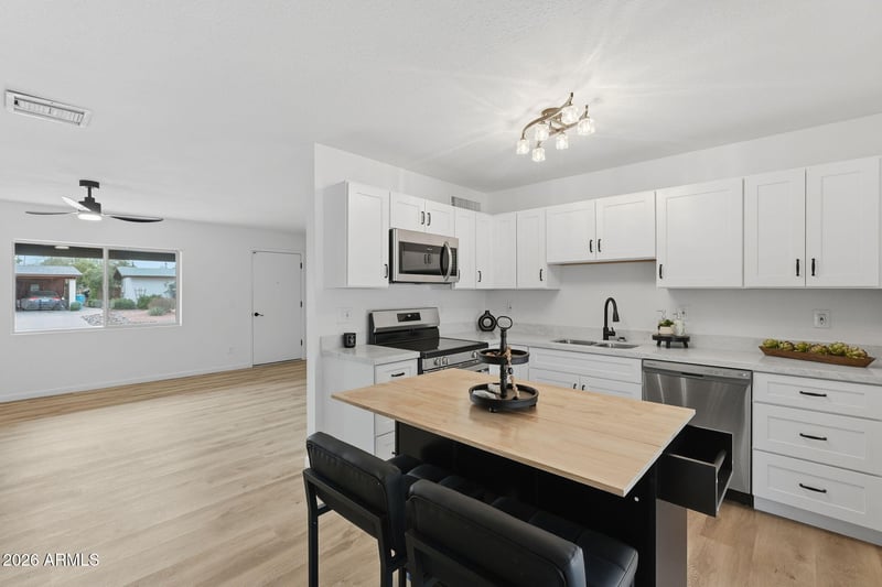 Listing details for 2134 Beck Ln, Phoenix, AZ 85022 : This one checks all of the boxes! Completely updated plus new AC (2025), new roof (2026) 1054sf, 2 bd, 1 3/4 ba in an ADULT community. This move-in ready home has been completely refreshed from top to bottom. LVP, new baseboards, fresh interior/exterior paint, and a bright open feel. Kitchen features quartz countertops, new cabinets, new plumbing fixtures, & Frigidaire appliances. Island that opens to eating space. New light fixtures and ceiling fans throughout. Both baths are completely remodeled The screened-in porch w/new indoor/outdoor carpet creates the perfect space to relax year-round, overlooking a large yard with ideal north/south exposure. The community offers resort-style amenities including a pool, clubhouse, pickleball court, and a full calendar of social activities