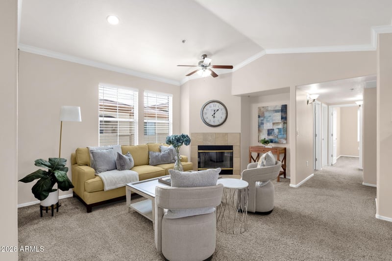 This recently refreshed 3-bedroom, 2-bathroom residence in the gated Arpeggio Condominium community features the largest floor plan available, with a desirable split layout that maximizes space and comfort. Vaulted ceilings, crown molding, and a cozy fireplace create an open yet inviting living and dining area, while the well-appointed kitchen features stainless steel appliances, granite countertops, tiled flooring, a large pantry, and a built-in work desk ideal for everyday living or working from home. Two bedrooms include generous walk-in closets, and the home has abundant storage throughout, along with can lighting, ceiling fans with lights, and a full-size washer and dryer. Spacious Design, Thoughtful Upgrades, and an Unbeatable Tempe Location.