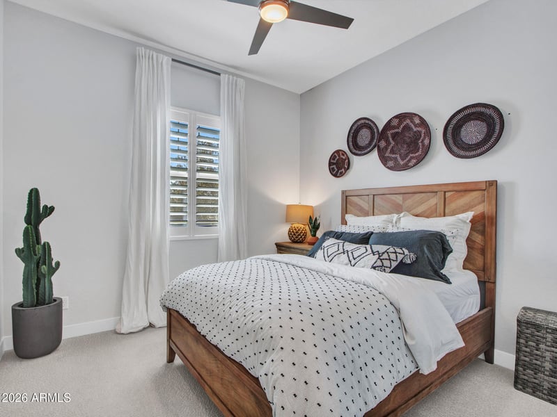 Listing details for 2140 141st Ave, Goodyear, AZ 85395 : Perfectly positioned in the heart of North Goodyear's most vibrant corridor, this stunning, former Model home offers the ideal blend of modern luxury, comfort, & lifestyle. Nestled within the gated community of Vistas at Palm Valley & adjacent to the Palm Valley Championship West Golf Course, this 2021-built single-story townhome invites you to experience effortless Arizona living at its finest. All the amenities you want are here, including 10' ceilings throughout, custom light fixtures, designer-inspired accent walls, high-end plantation shutters, & elegant drapery to add warmth & sophistication throughout the home. The gourmet kitchen is anchored by an oversized granite island, stainless steel KitchenAid appliances with a sleek 5-burner gas cooktop & abundant cabinetry. A large, center-opening, glass slider opens to a charming Alumawood® covered side patio with a gas fire pit perfect for relaxing evenings at home. The great room seamlessly blends dining & living spaces, enhanced by two additional oversized sliding glass doors that lead to the expansive back patio with power privacy/sunshade, and no neighbors behind. The split, primary suite serves as a tranquil escape, with a spa-like bathroom featuring a large walk-in shower, executive-height dual sink vanity, & a generous walk-in closet. Additional highlights include a well-appointed laundry room with sink & cabinetry. Residents of this desirable community also enjoy access to a resort-style pool & barbecue area. Located within highly rated school boundaries & just minutes from major freeways, shopping, dining, & entertainment, this home offers not only exceptional living but also unmatched convenience. Welcome home!