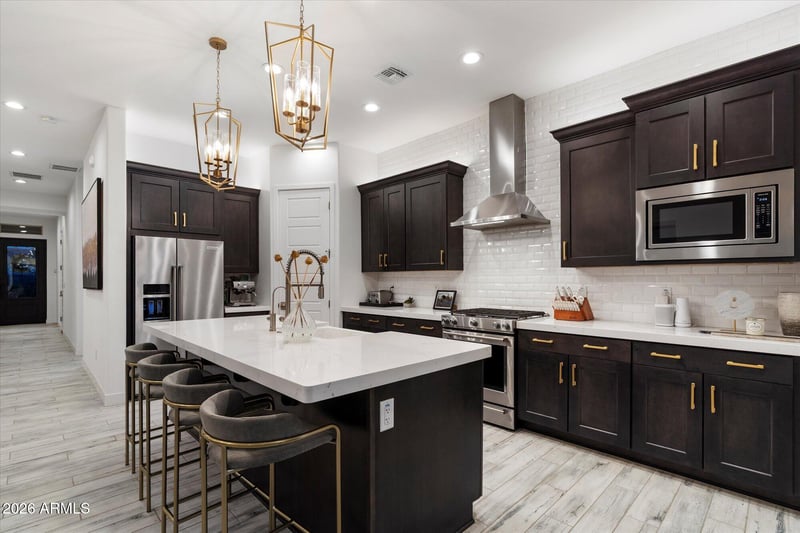 Listing details for 21514 58th St, Phoenix, AZ 85054 : a farmhouse sink, and premium KitchenAid appliances. Sophisticated touches continue throughout, including LED lighted cabinets, polished nickel fixtures, and wood-look tile flooring that flows seamlessly through the main living areas. The thoughtfully designed floor plan features 3 bedrooms PLUS a den, 3 bathrooms, and a 3-car tandem garage with 220V service. The luxurious primary suite offers the ultimate retreat, complete with motorized shades, floating dual vanities, and a freestanding soaking tub. Additional highlights include a well-appointed laundry room with cabinetry and sink, as well as theater and security pre-wiring for modern living. Additional upgrades and enhancements add even more appeal and functionality, such as epoxy-coated garage floors, a Kinetico hybrid water softener and drinking water station, professionally designed backyard landscaping with custom lighting, electric shades in the master suite and living room, a complete gutter and drainage system, a Be-Hyve smart irrigation system, a smart garage door opener, and custom lighted front entry steps. Don't miss this rare opportunity to own a newer build in North Phoenix's highly desired Desert Ridge and just minutes away from the JW Marriott where you can watch spectacular fireworks right from your backyard.