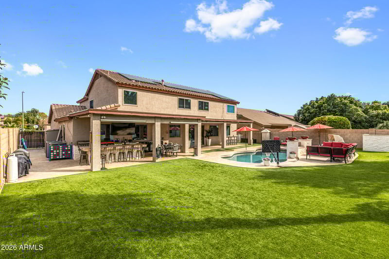 Listing details for 21628 85th Ave, Peoria, AZ 85382 : From the moment you walk through the front door, you're welcomed by an open sightline straight to the beautifully renovated backyard. The home features updated flooring throughout, fresh interior paint, and newer windows that fill the space with natural light while enhancing energy efficiency and year-round comfort. To the left of the entry is a front living space thoughtfully converted into an entertainment area, while the right side offers a formal dining room. Down the hallway, you'll find a spacious laundry room, powder bath, and a large downstairs suite with its own full bathroom -- ideal for guests or multigenerational living. The kitchen showcases upgraded countertops and appliances, a large island, and generous counter space, opening to the family room with... a renovated fireplace and mantel. A large storage closet is tucked under the staircase for added functionality. Upstairs, a spacious mid-level landing leads to a bonus room/guest room, three additional bedrooms, and a full bathroom. The primary suite is expansive and includes a bonus sitting room or office space, two walk-in closets, and a large primary bath. Each bedroom is equipped with new ceiling fans with remote controls. As you walk out front, enjoy the impressive curb appeal with artificial turf, a spacious front patio, and a welcoming entry. Permanent 360-degree exterior lighting enhances the home beautifully at night, both front and back. The three-car garage offers additional storage space, and the extended driveway includes an RV gate for trailer or RV parking (with HOA approval). The backyard is designed for entertaining and relaxation, featuring a fully renovated pool, travertine patio throughout, a built-in outdoor kitchen with a large island, and built-in speakers under the covered patio that spans the length of the home. A sunshade has been installed along the patio exterior for added comfort. Artificial turf provides low-maintenance landscaping, complemented by a retaining wall ready for plants, trees, or shrubs. A dedicated dog run is located along the south side of the home. Enjoy breathtaking Arizona sunsets from your private backyard retreat -- a space designed for both entertaining and everyday enjoyment.