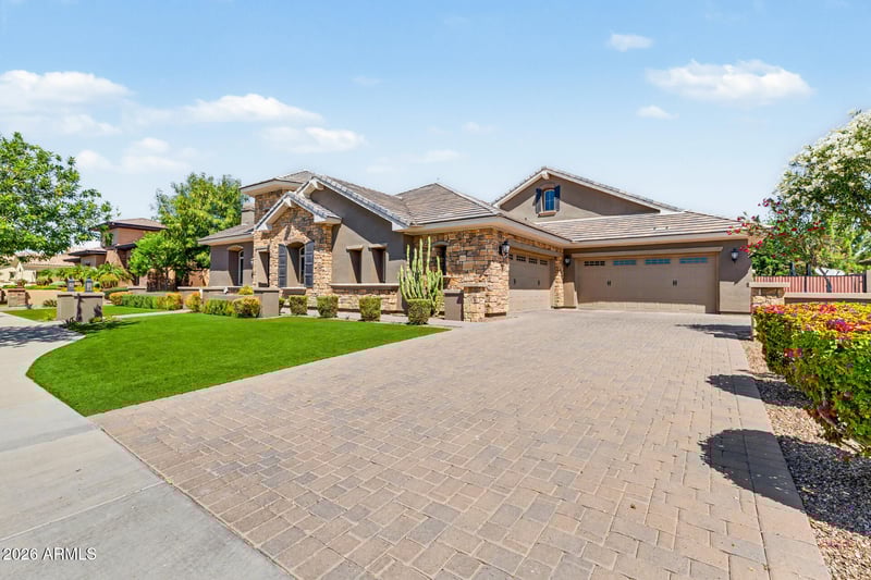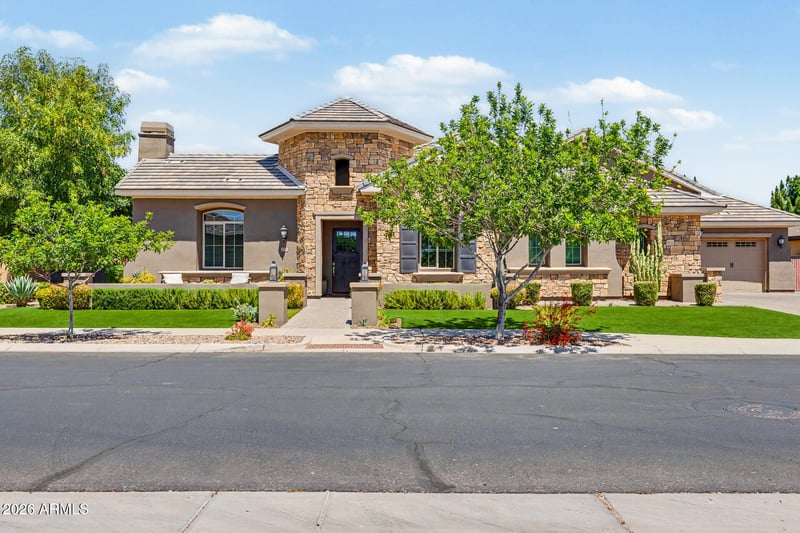 Listing details for 2174 Mead Dr, Gilbert, AZ 85298 : This beautiful basement home truly has it all! With 6BRs (all with on suite baths) and a total of 8 bathrooms. Perfect for your large crew and/or multigenerational living. The quiet spacious office with a front yard view is perfect for WFH. Formal sitting area provides a cozy space to read or chat. Dining area is adjacent to the massive kitchen/family room space. Kitchen island seats 7. With high end gourmet appliances, built-in fridge, coffee bar, huge food pantry and butler's pantry, you'll be equally equipped for a formal event or Sunday morning pancakes. **The primary suite has a spa-like bath, huge custom closet and sitting area. **Main level has 3 more bedrooms, an adorable playroom, mud room and spacious laundry**Basement has 2 more bedrooms/baths, family room, kitchenette with... with beverage center, ice maker, wine fridge and pantry (or board game closet!). Front and back yards are both beautiful and low maintenance with faux turf and easy-care plants. This means all your outdoor time can be spent enjoying the pool and spa with heater/chiller, in ground trampoline and space for all the outdoor games. B/I gas BBQ. Plus, raised gardening beds! All this in a friendly, gated community just minutes from all of the great shopping and dining that Gilbert has to offer.