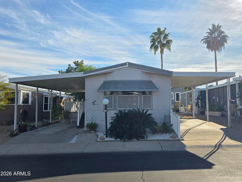 Listing details for 2233 Behrend Dr #81, Phoenix, AZ 85024 : Enjoy living in the gated 55+ Boulder Ridge community, offering great amenities and an active lifestyle. Adorable 2 bed, 2 bath features 1,040 sf with laminate flooring (2022) in main living areas and carpet in the bedrooms and great room. The primary suite includes double sinks and a walk-in closet. Kitchen offers a stainless steel refrigerator and range, dishwasher, countertop microwave, and garbage disposal. 2022 Washer/dryer included. HVAC 2021. Roof Replaced 2018. Home features split carports, upgraded large front Trex deck, rear deck with ramp, storage shed. Underside Vapor barrier, insulation, jacks all good. Park Approval Required prior to writing offers: 750+ credit score, verifiable income 3x lot rent, proof of savings 6x lot rent, & background check. Lot rent $1,010/monthly.