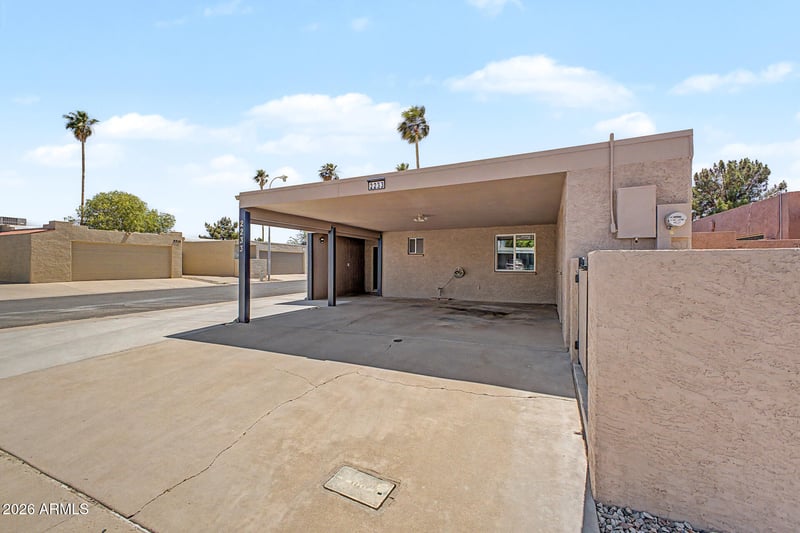 Listing details for 2233 Recker Rd, Mesa, AZ 85215 : Move-In Ready End-Unit Low Maintenance Patio Home w/Golf Course Views! This charming 2-bdrm home offers an ideal blend of updates and outdoor enjoymt. Both bdrms include ceiling fans. The primary suite features a walk-in closet, upgraded vanity/sink/faucet, and TV. Brand new appliances: GE refrigerator, GE stove/oven, and water heater. Recent improvements: new dual-pane vinyl windows throughout, a new covered entryway, and a versatile new studio/office addition with A/C, sink, dedicated electric panel, and sliding glass doors to the breakfast nook. The gated patio overlooks the greenbelt with shade screen and newer block & view fencing -- perfect for pets. Additnl perks: gutters, 2-car covered carport w/2 storage rms + 1 xtra parking slab, & sep. walled/gated area for trash/recycling bins.