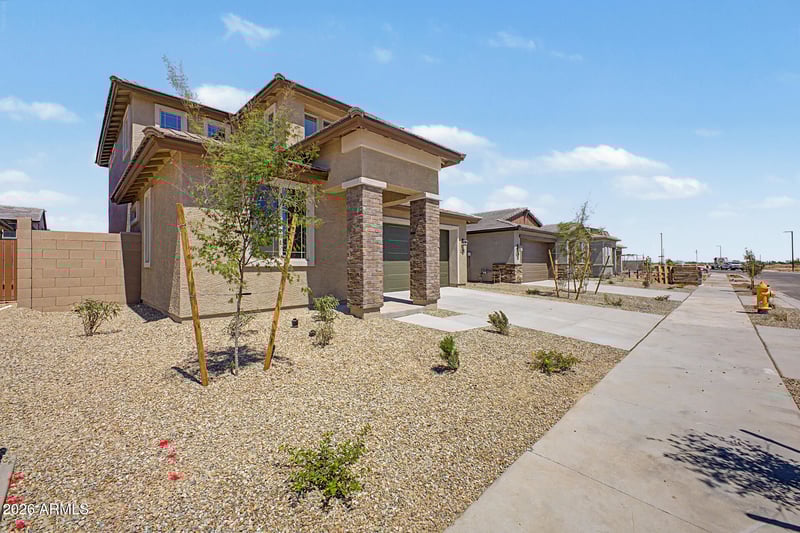 Listing details for 22342 Irma Ln, Surprise, AZ 85387 : Mountain views, north/south lot, pool sized yard, brand new floor plan, wow! Four bedrooms, three full bathrooms, a huge loft too. Entertain in this spacious great room, dining, and beautiful kitchen. Home has 9' ceilings throughout, 8' interior doors, soft water loop, stair railing! GE stainless steel appliances with gas range, single bowl sink, huge island with breakfast bar, and a large walk-in pantry. Beautiful granite countertops and cabinets, matte black hardware and finishes. Efficient Smart Home. Spacious primary bedroom and bathroom, dual sinks. Bedroom and full bath downstairs, all baths include upgraded square sinks. Lots of storage, oversized garage too. April/May completion and great incentives!