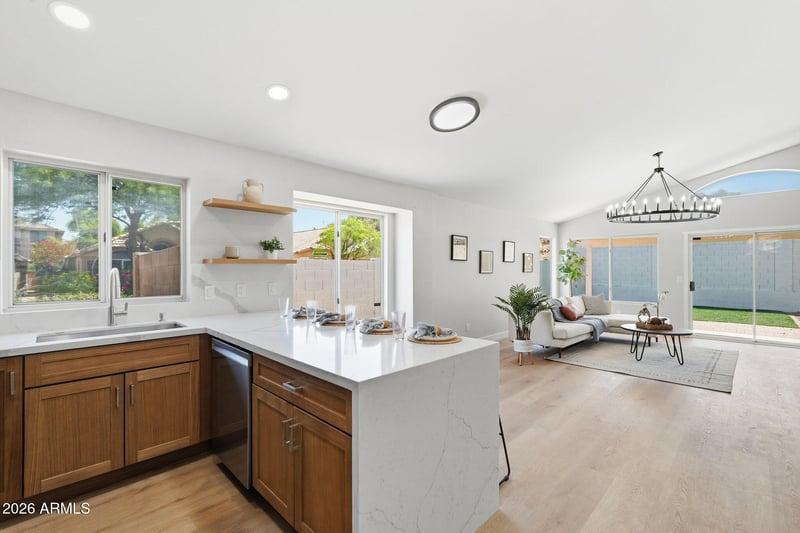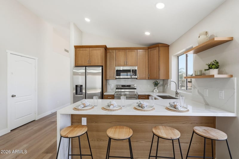 Listing details for 2239 Escuda Rd, Phoenix, AZ 85024 : Welcome to this beautifully remodeled home in the highly sought-after Northwest Valley of Phoenix! Perfectly situated on a desirable corner lot, this property offers stunning mountain views and convenient freeway access--making it easy to enjoy everything the Valley has to offer. Step inside to discover a thoughtfully updated interior featuring vaulted ceilings and an open, airy feel. The home has been completely renovated with brand-new flooring, modern cabinetry, elegant quartz countertops, and a full suite of new appliances. Along with a new roof and new A/C unit. The spacious primary suite boasts a custom tile shower, creating a spa-like retreat, while the family room showcases a unique designer accent wall that adds character and style. With three bedrooms and two bathrooms, this home offers both comfort and functionality. Major upgrades--including a new roof and new air conditioning system--provide peace of mind for years to come. Outside, the low-maintenance backyard is perfect for entertaining and everyday living, featuring artificial turf and a paver patio ideal for barbecues, gatherings, or a safe space for kids and pets to play. Don't miss your chance to own a move-in-ready home in one of Phoenix's most desirable areas!
