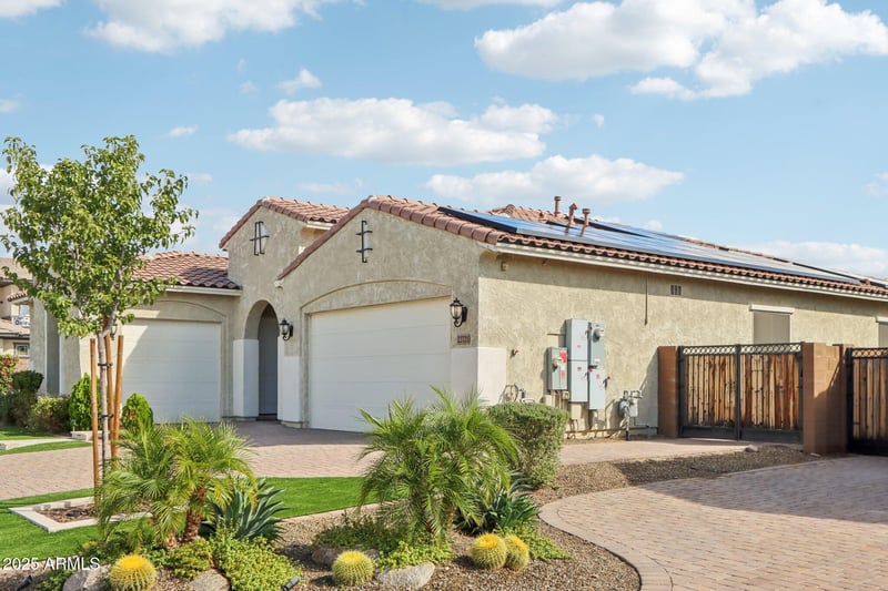 Listing details for 22721 34th St, Phoenix, AZ 85050 : Welcome to luxury and energy efficiency in Sky Crossing! This stunning 4-bedroom, 3-bathroom home with a large office offers 2,457 sq. ft. of living space on an oversized corner lot. Built in 2021, it features a heated pool with water feature and UV sterilizer, gazebo, children's play area, and beautifully landscaped yards. Inside: luxury flooring, extra-high ceilings, open-concept living, Monogram Wi-Fi stainless appliances, quartz countertops, and walk-in pantry. The spacious primary suite offers custom wood flooring, soaking tub, double vanities, and walk-in shower. Enjoy a 3-car garage with epoxy floors, 240V EV charging, insulated doors, and storage racks. Includes Tesla solar with 2 Powerwalls, Google security, soft water & RO systems. Community amenities include pool, fitness center, parks, and pavilions.