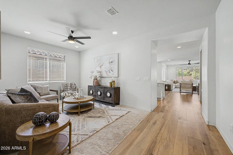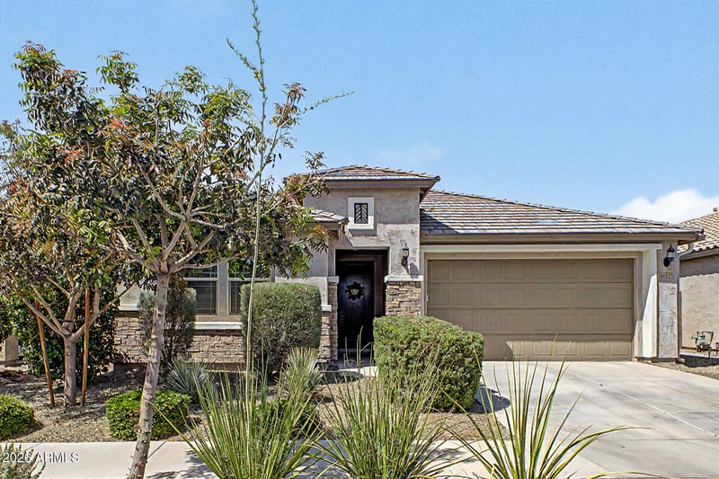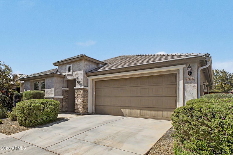 Listing details for 22836 Marsh Rd, Queen Creek, AZ 85142 : The most popular floorplan in Harvest at Queen Creek! The beautifully manicured landscape, stone-accented facade, and 2-car garage are just the start. Inside, you'll find bright and airy living spaces ready to bring you joy, showcasing wood-look flooring, contemporary lighting, modern ceiling fans throughout, customized chefs kitchen, and stylish neutral colors. The open-concept kitchen is equipped with ample cabinetry, adorned with crown molding, tile backsplash, quartz countertops, stainless steel appliances, and an island with a breakfast bar, perfect for entertaining and quick bites. The owner's suite is a true retreat, offering a private bathroom with an oversized dual-sink vanity, supersized shower, and walk-in closet. Backyard is a culinary masterpiece with gardens and edible plants for entertainment, casual dining with your loved ones, storage, or your dream garden, including a cozy covered patio and a grass area perfect for games. Hurry up, this gem won't last!